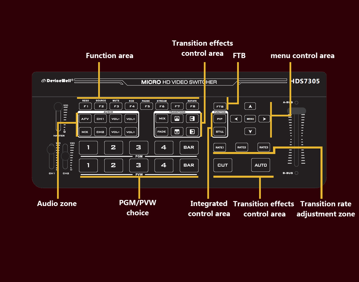HDS7305 director switcher adds 3 audio faders, you can use the audio faders to adjust the audio sound, and you can also choose to use the buttons to adjust the volume, (the adjustment mode can choose one of 2)