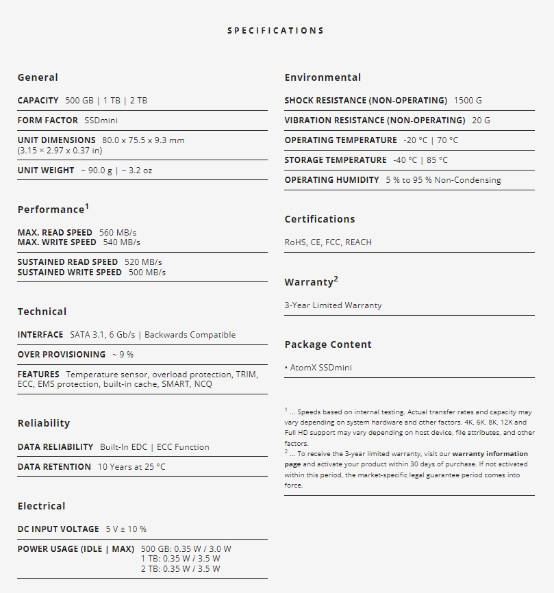 Custom designed for Atomos Ninja V/V+, Ninja Flame, Ninja Inferno, Shogun Inferno and more… this powerhouse is 20% smaller than the standard SATA SSD with full-feature high-frame rate recording performance. Fully supports Apple ProRes, ProRes RAW, CDNG RAW at 30p, Avid DnX and CDNG with ease. The Stable Stream™ performance combined with a sustained write speed of 500 MB/s, ensures smooth, high-res captures of each and every frame.
